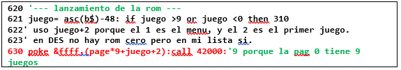 La rutina que te permite saltar a un juego comienza en la 620 y es invocada cuando pulsas un número. Como ves justo al final se invoca la rutina que hemos ensamblado en la 42000